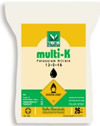 Multi-K este un ingrasamant total solubil in apa, compus in intregime din elemente nutritive accesibile 100% pentru plante: 13% azot si 46% potasiu sub forma K2O. Confera mare rezistenta la boli, daunatori si seceta. Cresc productiile cantitativ, dar mai ales calitativ.